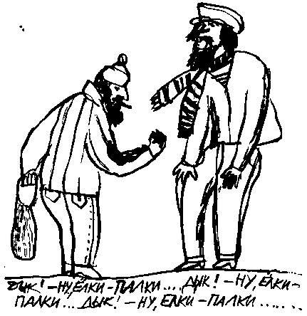 ЕЛКИ-ПАЛКИ (чаще всего “ну елки-палки”, еще чаще ну елы- палы”) - второе по употребимости выражение. Выражает обиду, сожаление, восторг, извинение, страх, радость, гнев и др. Характерно многократное повторение. Например, если митек ищет затерявшуюся вещь, он на всем протяжении поисков чрезвычайно выразительно кричит;”Ну елы- палы! Ну елы-палы!” Очень часто употребляется в комплексе с дык”. Двое митьков могут сколь угодно долгое время переговариваться: - Дык! - Ну елы-палы... - ДЫК! - Ну елы-палы... Такой разговор может означать многое. Например, он может означать, что первый митек осведомился у второго - сколько времени? Второй отвечает, что уже больше 9 и в магазин бежать поздно, на что первый предлагает бежать в ресторан, а второй сетует на нехватку денег. Однако чаще всего такой разговор не выражает ничего, а просто является заполнением времени и самоутверждением митьков.