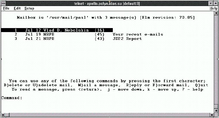 В заключение хотелось бы отметить, что возможности почты не ограничиваются только пересылкой корреспонденции. По почте можно получить доступ ко многим ресурсам Internet, которые имеют почтовых роботов, отвечающих на запросы страждущих. Поэтому имеет смысл более детально изучить программное обеспечение, поддерживающее e-mail. Время, затраченное на чтение документации и опыты, окупятся возможностью получения информации из информационных архивов сети.