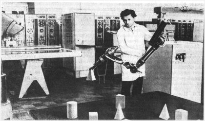 С самого начала я сформулировал задачу и по автоматизации двигательной (моторной) функции роботов. Мной была поставлена задача создать автоматическую руку на тележке, которая передвигалась вдоль щита управления любым объектом и переключала бы тумблеры, рубильники, поворачивала ручки и т.д., одновременно к ней добавлялось примитивное зрение, способное воспринимать только положение стрелки приборов или деления шкалы. Но, к сожалению, я не смог подыскать человека, который любил бы работать с механикой, руками. А эту задачу я поставил еще в 1959 году, когда о роботах никто не заикался. Если бы у. нас были хорошие мастерские, то мы могли бы в 1963 году первыми в мире иметь механическую руку. К сожалению, не все удается сделать.