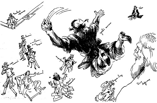 Тут персонажи соскочили со своих полок, задвигали стульями... В темпе,