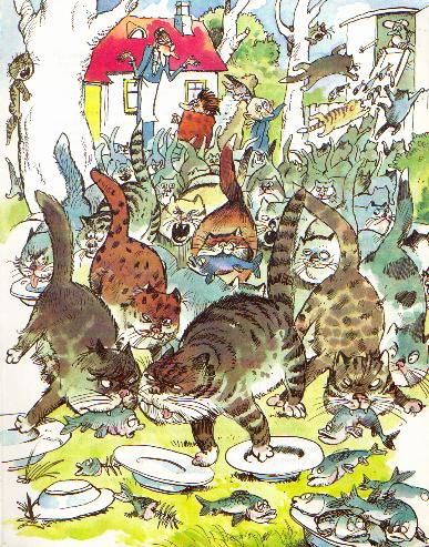 скатертью и подносом. Она суетилась и хлопотала, а кот сновал за ней по