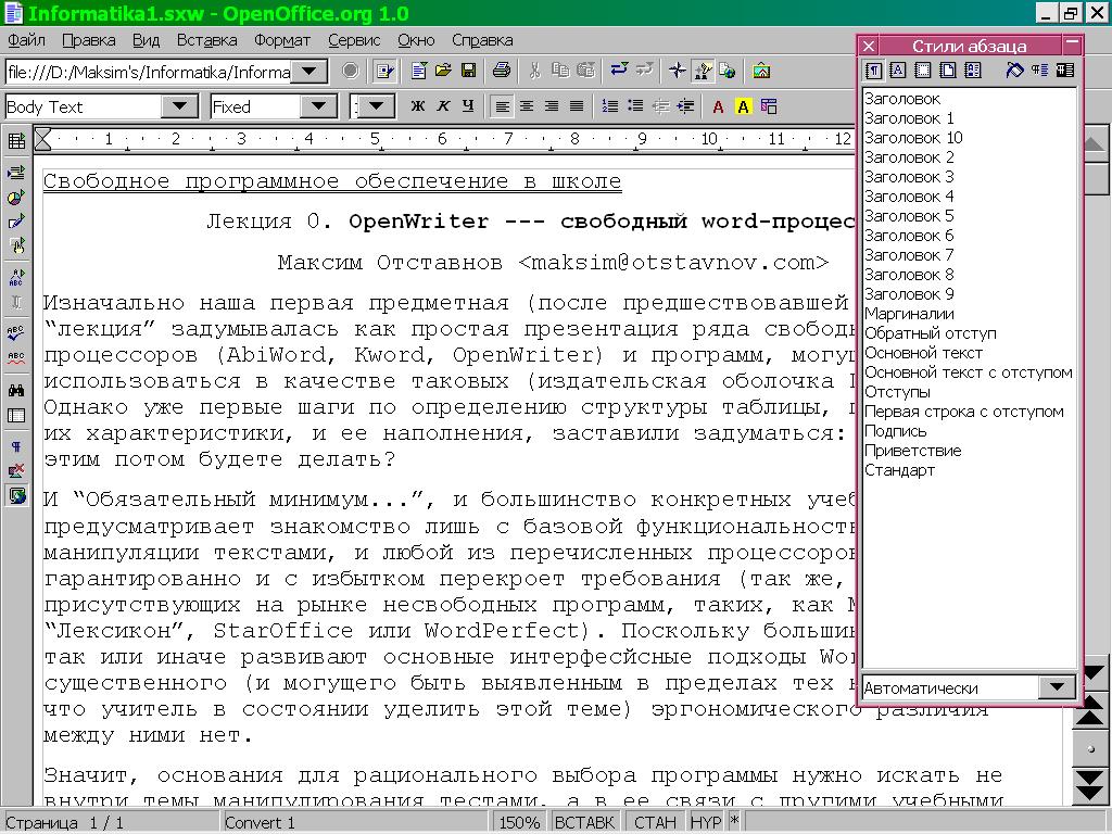 9. С.В.Андреев, Н.А.Роганова. Практическая информатика: Учебное пособие. Часть 1. -- М.: МГИУ, 2001. -- 348 с. Это тоже свободная книга под GNU FDL, ее можно купить на бумаге или скачать отсюда: www.ctc.msiu.ru/materials/books.php. Пособие консервативно и, несмотря на обновление, пока описывает StarWriter 5.2, а не OW; впрочем, как уже отмечалось, разница между ними с точки зрения пользователя невелика.
