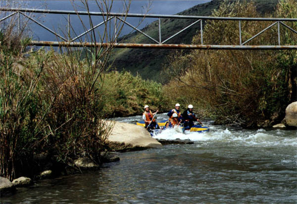 Поспасав друг друга, собираемся в путь. Перед нами участок маршрута, который на иврите называется "Maim soarim" (бурная вода?). Экипажи немного перетасованы: Вова пересаживается на двойку, а Маша - на четверку. Обносим небольшой обмелевший участок (вообще, воды, говорят, маловато - около 10 кубов. На Иордане очень короткий сезон - 2-3 месяца). Начали. Начинаются пороги. "Первые камни", за ними заходим в улово и ждем остальных. У меня опять сдулась подушка, уже вторая по счету. Делать нечего, привязываем к раме канистру с водой и я на нее восседаю. Судьба-злодейка на что-то намекает, но как-то уж слишком тонко.
