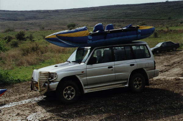 Загружаемся. Кормановскую двойку - на его же машину. Остальные каты - на тендер, одолженный Мишей у проживающего в мошаве владельца (?) велосипедно-прокатной конторы. Грузим так: сначала - четверка килем вниз, под углом 40o к горизонту. На нее, килем кверху - двойку (невероятно, но факт: после получаса езды в таком положении двойка, которая была сверху, сдулась практически до минимальных своих размеров). Получилась эдакая абстрактная композиция под кодовым названием "наш ответ катюшам".
