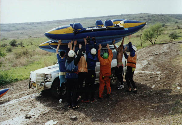 Примерно в это время подъехал трактор, груженый 6-местными рафтами и автобус, груженый будущими пассажирами этих рафтов и их инструкторами. Из пассажиров заполнилась некая девица, которая так ощутимо тряслась от холода, что ей выделили гидро-рубаху с инструкторского плеча. Мы, отягощенные опытом трех дней сплава, смотрели на этих несчастных свысока. Да еще и наши стройные птицы-каты не идут в сравнение с их калошами. Вобщем, что там говорить? Жалко времени, как говорят аборигены.