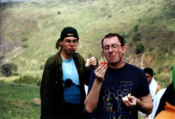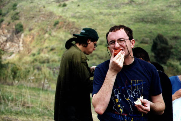 Итак, загрузив багажник своего Форда Эскорт всевозможной провизией, я отправился в путь. Мой маршрут пролегал через Реховот (где я забрал Машу) и через Холон (где живет Наташа). Выехав примерно в 8:30 из Холона, мы направились на север. Тут мы (точнее - Маша) вспомнили, что на гитаре Корманов, которую мы захватили в последний момент, не хватает струны. Вечно голодный Я воспользовался этим, и подрулил к какому-то придорожному торговому центру якобы для подзаправки и покупки струн (каковых там не оказалось), а на самом деле - за Мак-Дональдсом (которого тоже не было). Сошлись на бутерброде с ветчиной и стакане колы, однако посидеть и поесть девушки мне не дали, велели есть на ходу, за что и поплатились: кола, поставленная на полочку рядом с приборной доской, на первом же повороте свалилась в отделение над бардачком и там разлилась небольшим сладким озером. Отделение оказалось на редкость герметичным, ни капли колы в бардачок не пролилось. Быстренько исчерпав инциндент теперь уже пустым стаканом от колы, я снова сел за руль и мы покатили дальше.