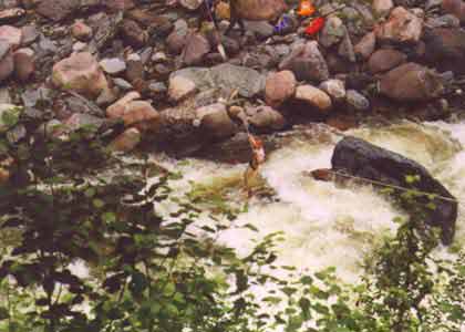 Дальнейшие препятствия - это большие подводные и надводные камни, бочки, стоячие валы, узости и прижимы. Для того чтоб проходить ущелье, необходимо иметь нормальную группу с хорошей организацией страховки, и воду ниже среднего. Порог - водопад обносится по правому берегу всего 100 - 150 метров. Дальнейшие препятствия проходимы. Нам эти оба условия не подходят, и мы обносимся. Группа из Кирова достаточно сильная, но из-за высокой воды они тоже обносятся. Мы обносились по нижней тропе до того места, когда она подходит непосредственно к реке. В этом месте расположена более менее