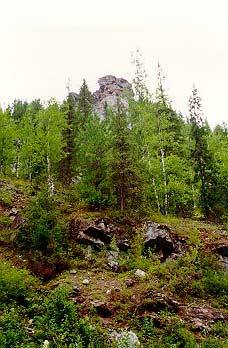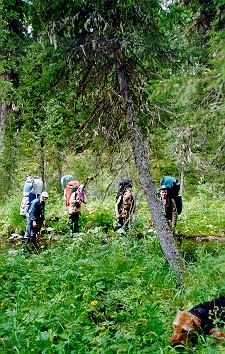 Вышли в 12.20. Идя по прежнему азимуту, прошли до зимника. Пошли по нему. Местами зимник можно опознать только по зарубкам на деревьях. Мы поняли, что слишком забрали к югу. Немного пройдя по зимнику, свернули с него и пошли по азимуту 30, а примерно через 30 мин. - 45. Начали подниматься в гору. Идти стало сложнее. Шли переходами по 100-150 метров, останавливаясь минут на 15. Погода совсем испортилась - дн?м ни единого облака, жарко.