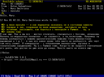 "Украден компьютер, если кто увидит..." и т.п. Модераторам эх-"дайджестов" (RU.FIDONET.DIGEST) следует опасаться ситуации, когда пишущие туда люди будут пытаться с помощью подбора чужих писем пропагандировать определенную точку зрения на то или иное событие # (например, выборы координатора). Бывает, что ответ на письмо в эхе появляется раньше, чем вопрос. Это может быть связано с тем, что на крупных узлах пакеты с более ранней почтой (содержащей вопросы) иногда тоссятся позже, чем с поздней (содержащей ответы). Иногда, взависимости от ситуации в эхе, необходимо принимать оперативные меры общего характера (запреты на обсуждение некоторых вопросов и тем, ограничения на письма из других сетей, ограничения на характеристики публикуемых объявлений и т.п. # # ). Такие меры могут быть временными, либо постоянными (тогда они должны быть зафиксированы в правилах). Реакция на модераториалыЕсли вы получили нетмейл с критикой своих действий - лучше ответить на него и вежливо разъяснить свою позицию. Сам факт того, что человек написал нетмейл (а не поднял флейм в эхе) характеризует его положительно, пусть даже критика прозвучала очень резко. В некоторых эхах модераторы в явной форме требуют какой-либо реакции нетмейлом на свои модераториалы (минимум - подтверждения, что нарушитель или его босс прочли письмо). В случае отсутствия подтверждения наказание может быть ужесточено с формулировкой "Игнорирование модератора". Иногда в эхах встречается явление которое называют "Хлопанье дверью". Если