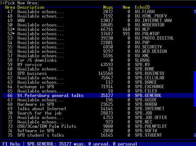 (SPB.SYSOP) - просто создается новая (SPB.SYSOP.INFO). Позднее описанное здесь состояние эх частично изменилось, однако вопрос о способе разделения возникал и в других случаях. Похожая ситуация была с SPB.FILES, дополнительно к которой появилась SPB.FILES.NEW В SPB.FILES.NEW стали публиковаться анонсы о новых файлах доступных для FREQ, а